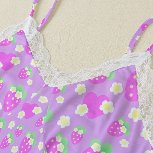 Strawberry Cutie Women's Cami & Shorts Lounge Wear Pajama Set With Lace Trim (Fruity Berry Purple)