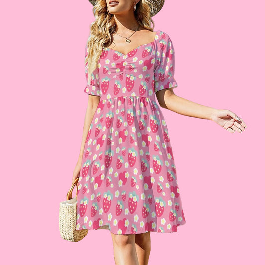 Strawberry Cutie Women's Sweetheart Neckline Puff Short Sleeve A-line Mini Dress (Fruity Berry Pink)