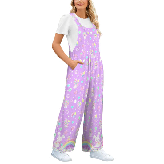 Rainbow Sweets Adjustable Strap Wide Leg Jumpsuit Overalls With Pockets (Purple)
