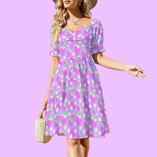 Strawberry Cutie Women's Sweetheart Neckline Puff Short Sleeve A-line Mini Dress (Fruity Berry Purple)