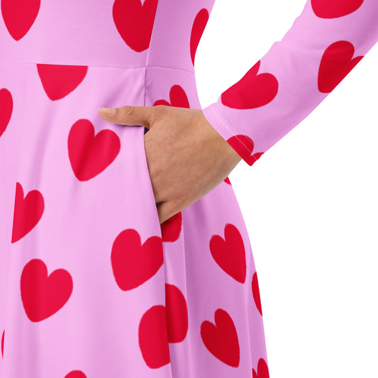Sweet Love Hearts Long Sleeve A-Line Midi Dress With Pockets (Red x Pink)
