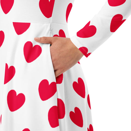 Sweet Love Hearts Long Sleeve A-Line Midi Dress With Pockets (Red x White)