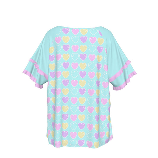 Sweet Love Hearts Blue Round Neck Raglan Sleeve Ruffle Frill T-Shirt