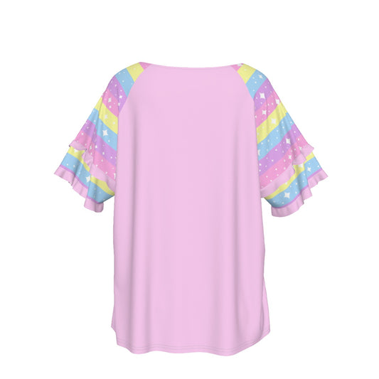 Rainbow Ribbon Round Neck Raglan Sleeve Ruffle Frill T-Shirt (Pink)