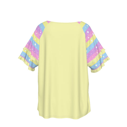 Pastel Stripes Yellow Round Neck Raglan Sleeve Ruffle Frill T-Shirt