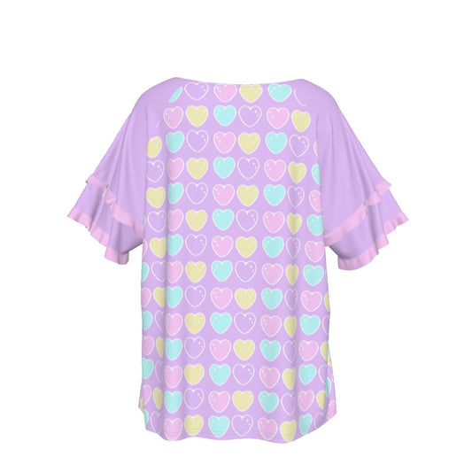 Sweet Love Hearts Purple Round Neck Raglan Sleeve Ruffle Frill T-Shirt