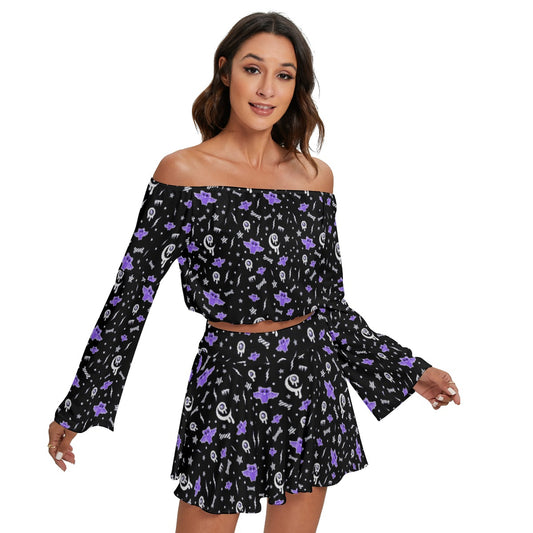 Milky Bat Night Women's Off The Shoulder Crop Top Blouse And Mini Skirt Set (Black)