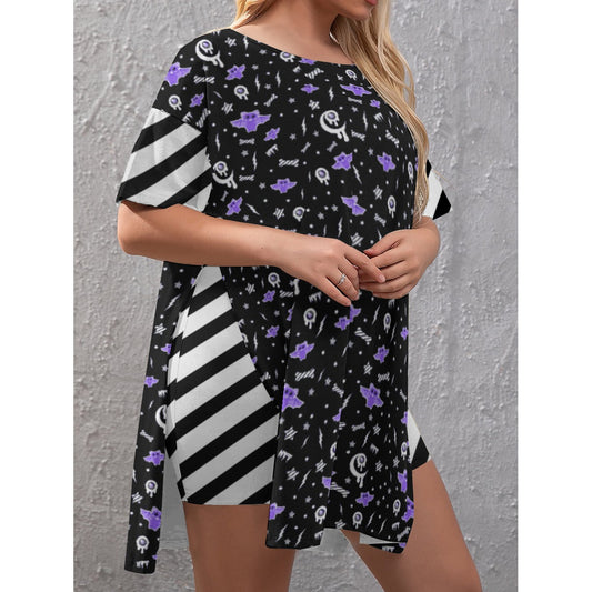 Milky Bat Night Women's Drop-Shoulder T-Shirt with Side Split and Shorts Set (Plus Size)