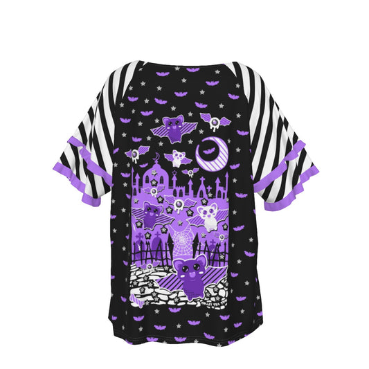 Spooky Bats Creepy Night Round Neck Raglan Sleeve Ruffle Frill T-Shirt