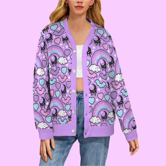Rainbow Spooky Bats Women's Ribbed Button Up Cardigan (Purple)
