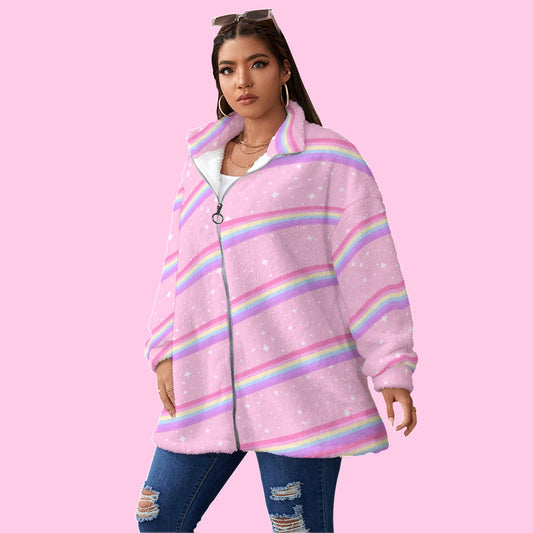 Kawaii Sparkle Cake Rainbow Beam Women's Oversized Fuzzy Fleece Coat With Zipper