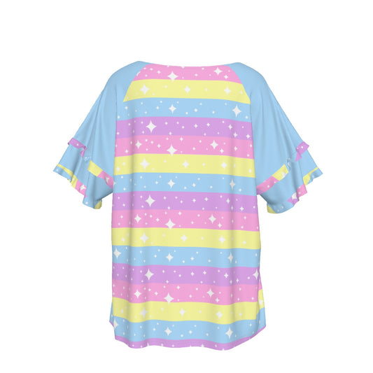 Rainbow Ribbon Round Neck Raglan Sleeve Ruffle Frill T-Shirt (Blue)