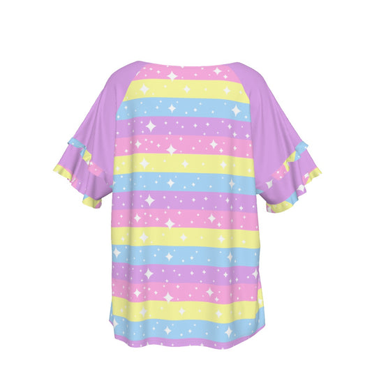 Rainbow Ribbon Round Neck Raglan Sleeve Ruffle Frill T-Shirt (Purple)