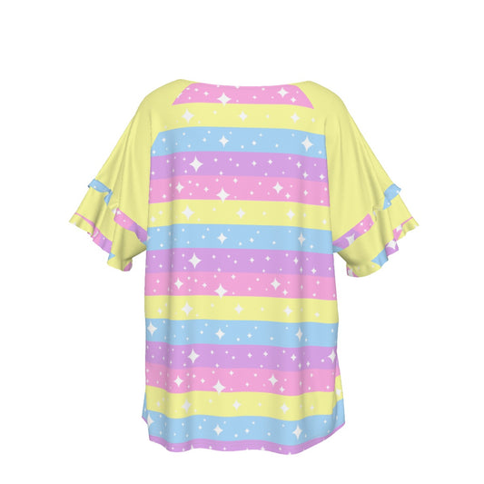 Rainbow Ribbon Round Neck Raglan Sleeve Ruffle Frill T-Shirt (Yellow)
