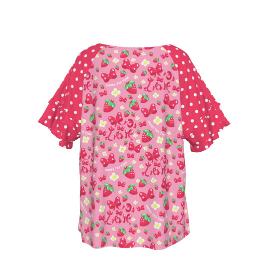 Strawberry Ribbon Round Neck Raglan Sleeve Ruffle Frill T-Shirt