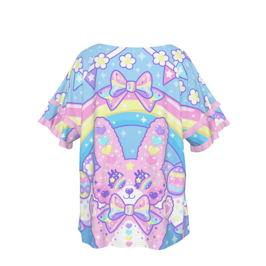 Magical Rainbow Easter Bunny Round Neck Raglan Sleeve Ruffle Frill T-Shirt
