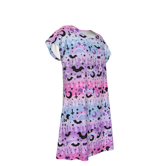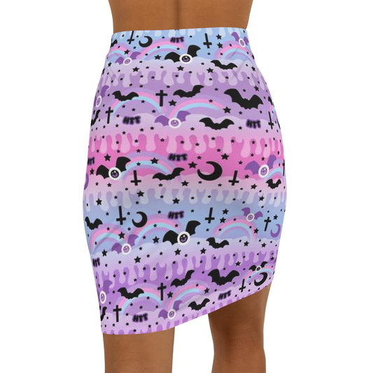 Spooky bats, stars, moons, crosses, bat eyes, dripping sky and pastel rainbows. This print was made with pastel goth and creepy cute fashion trends in mind.