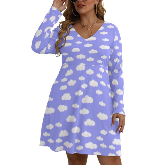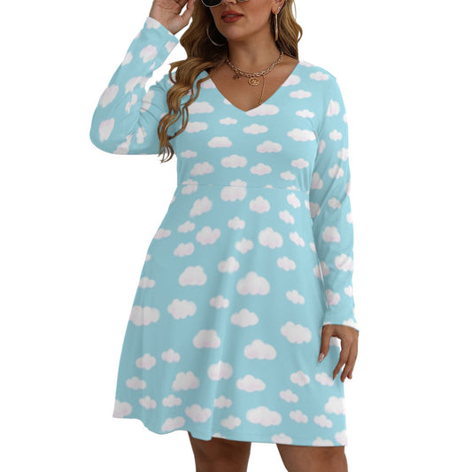 Dreamy Clouds (Sky Blue) Women's V-Neck Long Sleeve Dress (Plus Size)