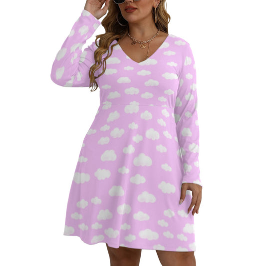 Dreamy Clouds (Taffy Pink) Women's V-Neck Long Sleeve Dress (Plus Size)