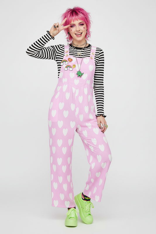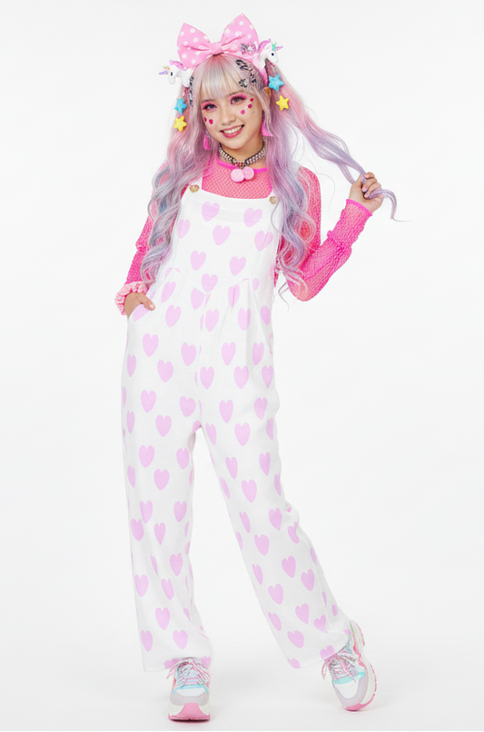 Sweet Love Hearts Adjustable Strap Wide Leg Jumpsuit Overalls With Pockets (White x Pink)
