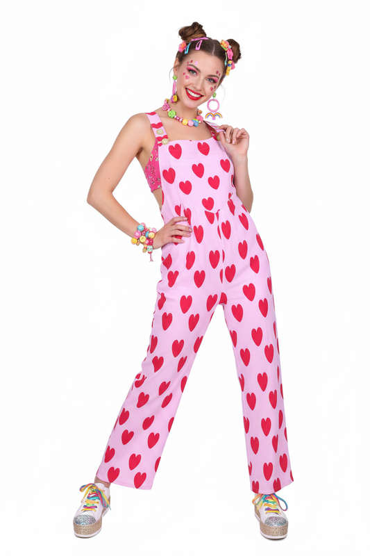 Sweet Love Hearts Adjustable Strap Wide Leg Jumpsuit Overalls With Pockets (Red x Pink)