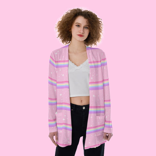 Kawaii Sparkle Cake Rainbow Beam Open Front Lightweight Cardigan With Pockets