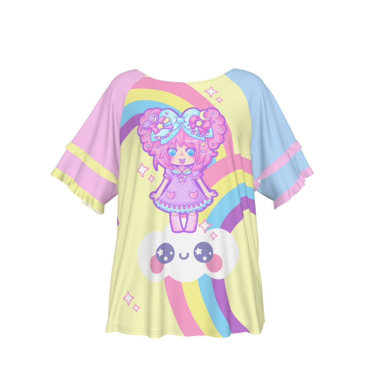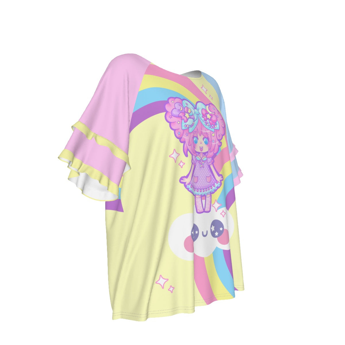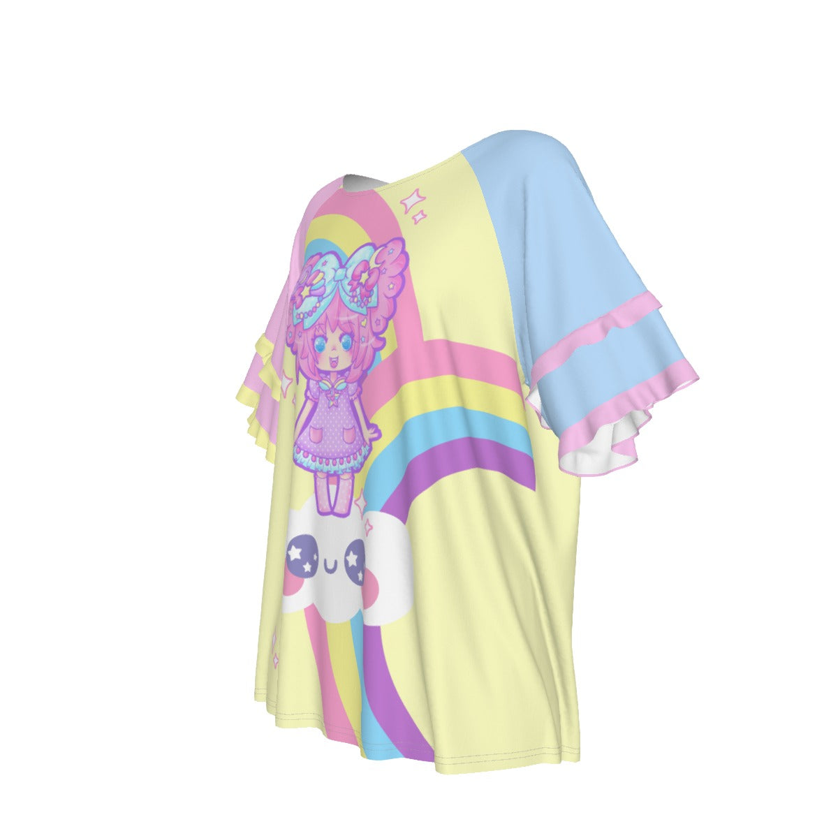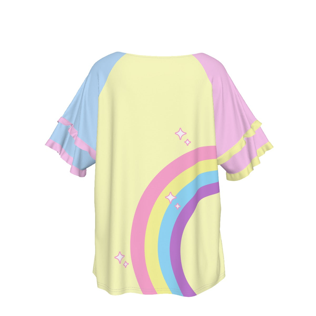 Bubbles Rainbow Land Round Neck Raglan Sleeve Ruffle Frill T-Shirt (Color Block)