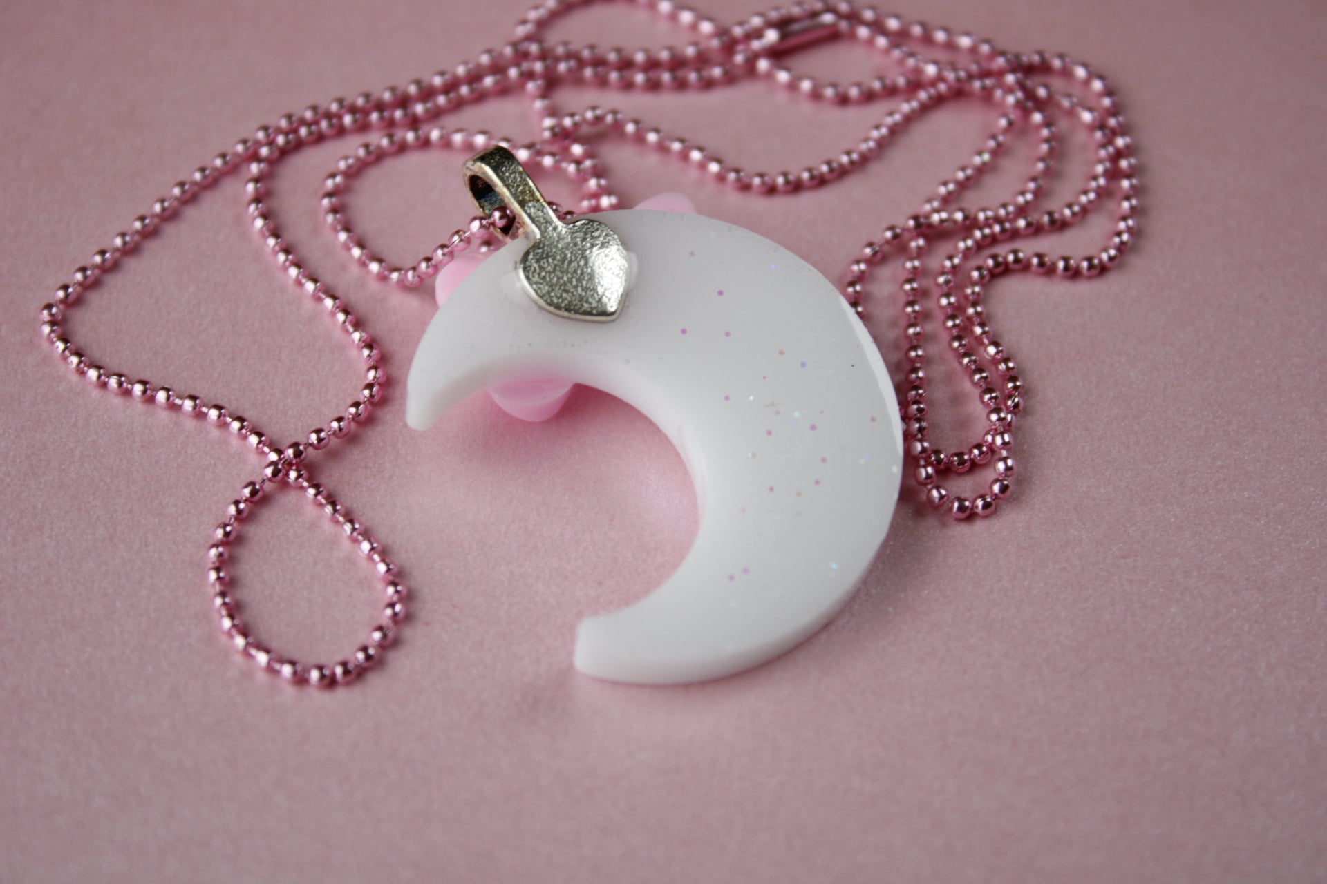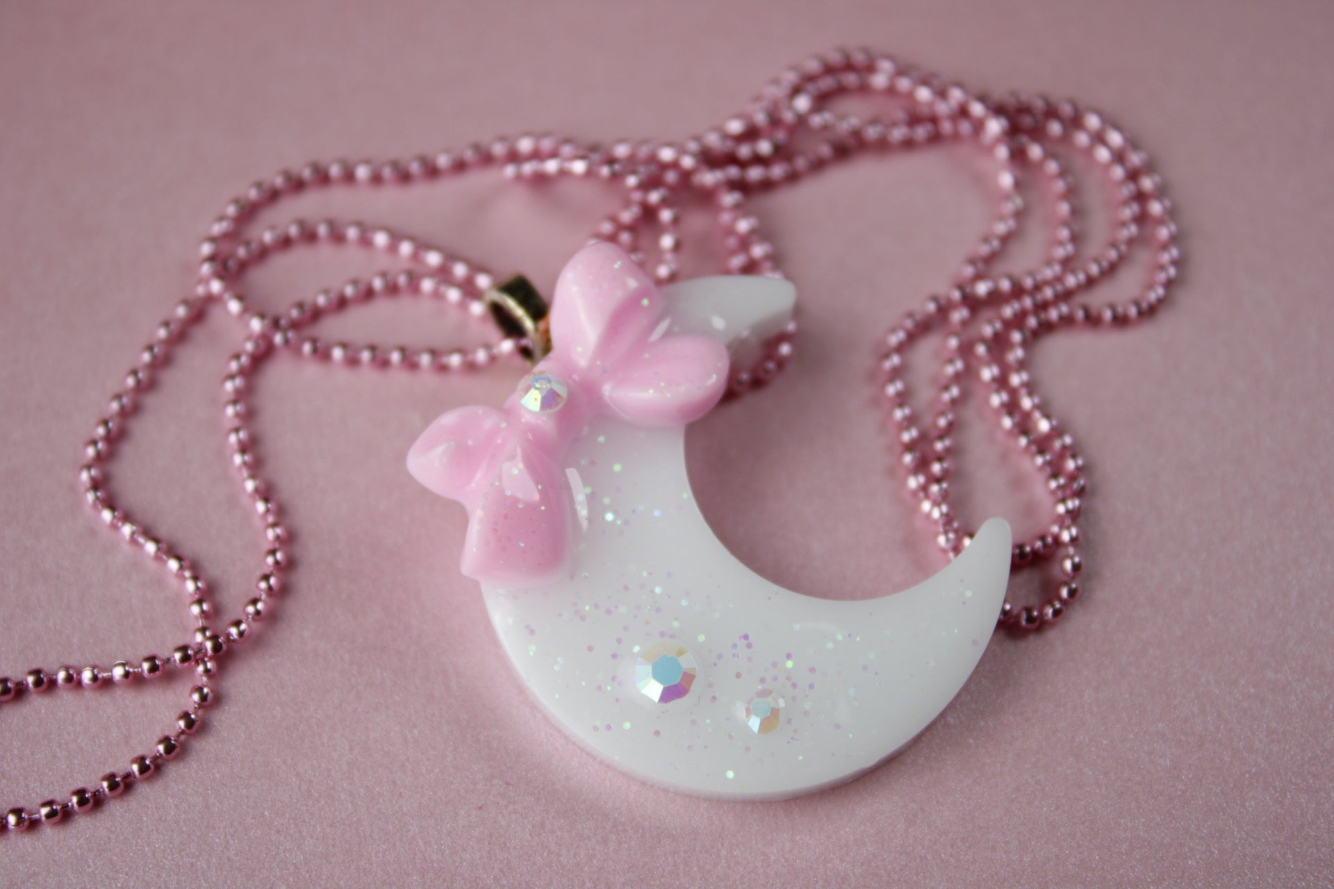 Cute and sweet crescent moon necklace. Medium sized pendant made with uv resin, glitter and sparkling rhinestones for an extra touch of fancy. Crafted from sturdy, high-quality materials, it’s built to last. Twinkling glitter with every movement, and the bright ball chain adds both durability and style. Perfect for sparkling up any outfit!
