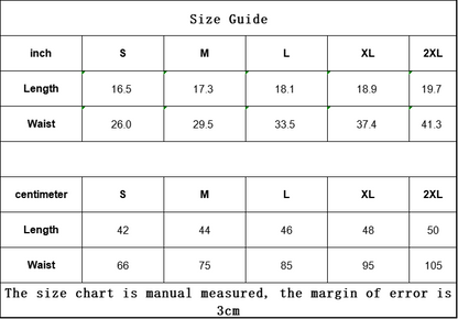 | Waist | 26.0 | 29.5 | 33.5 | 37.4 | 41.3 |