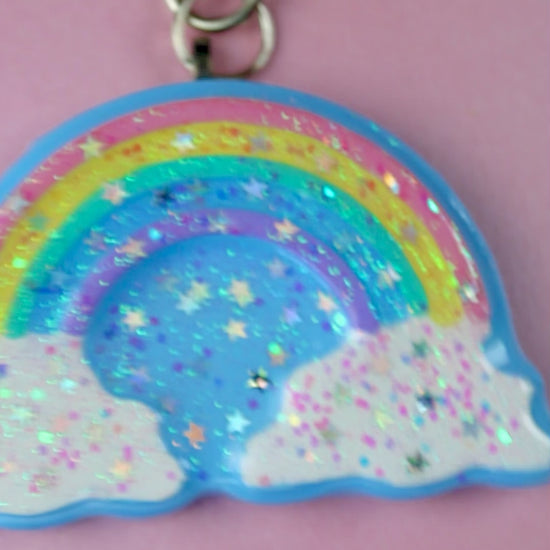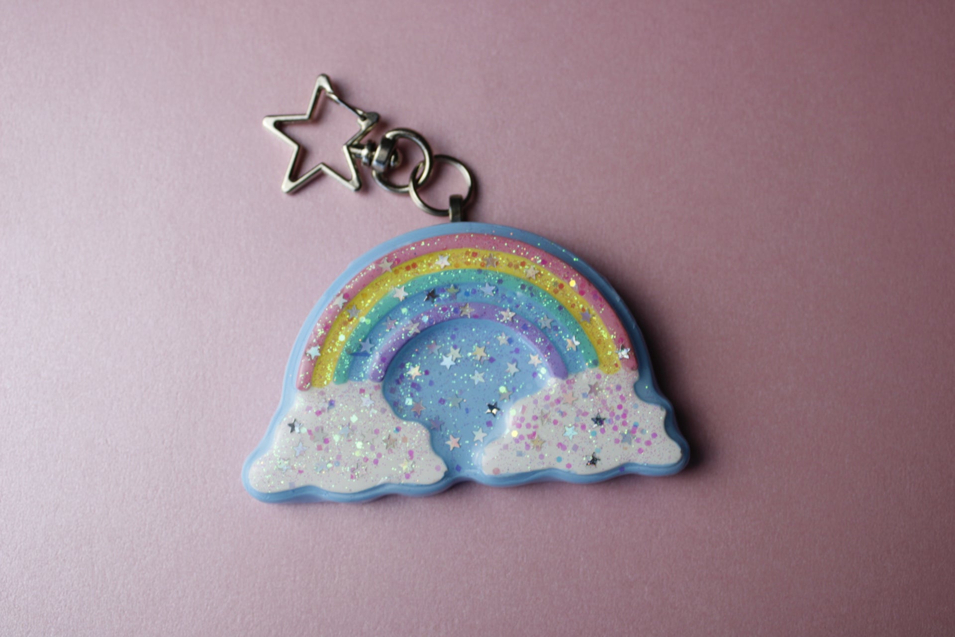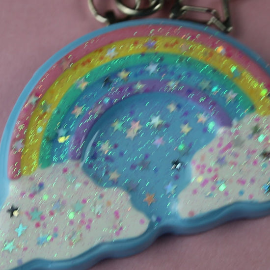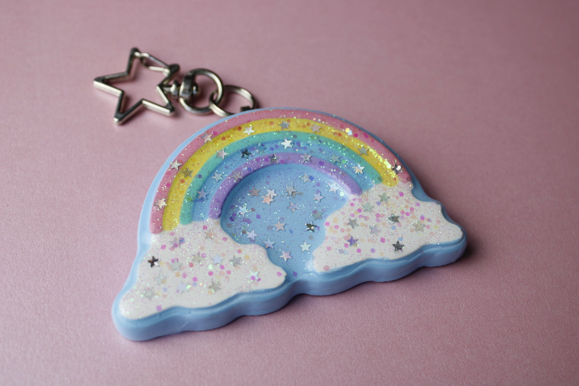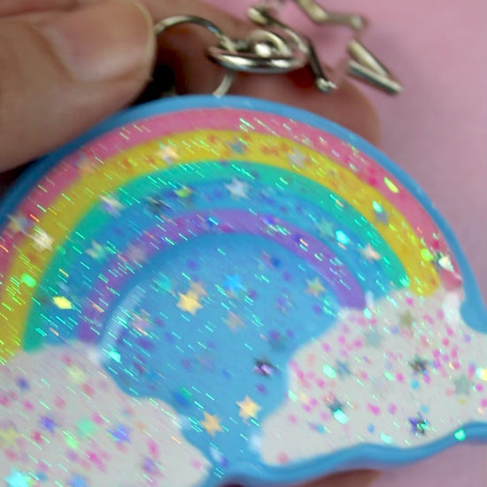 This adorable glitter keychain shines with rainbow clouds and holographic stars that sparkle from every angle. Extra-large and made to last, it features a star-shaped clasp for that perfect touch of charm and fun.