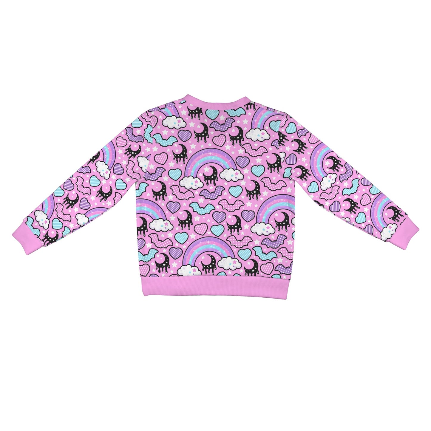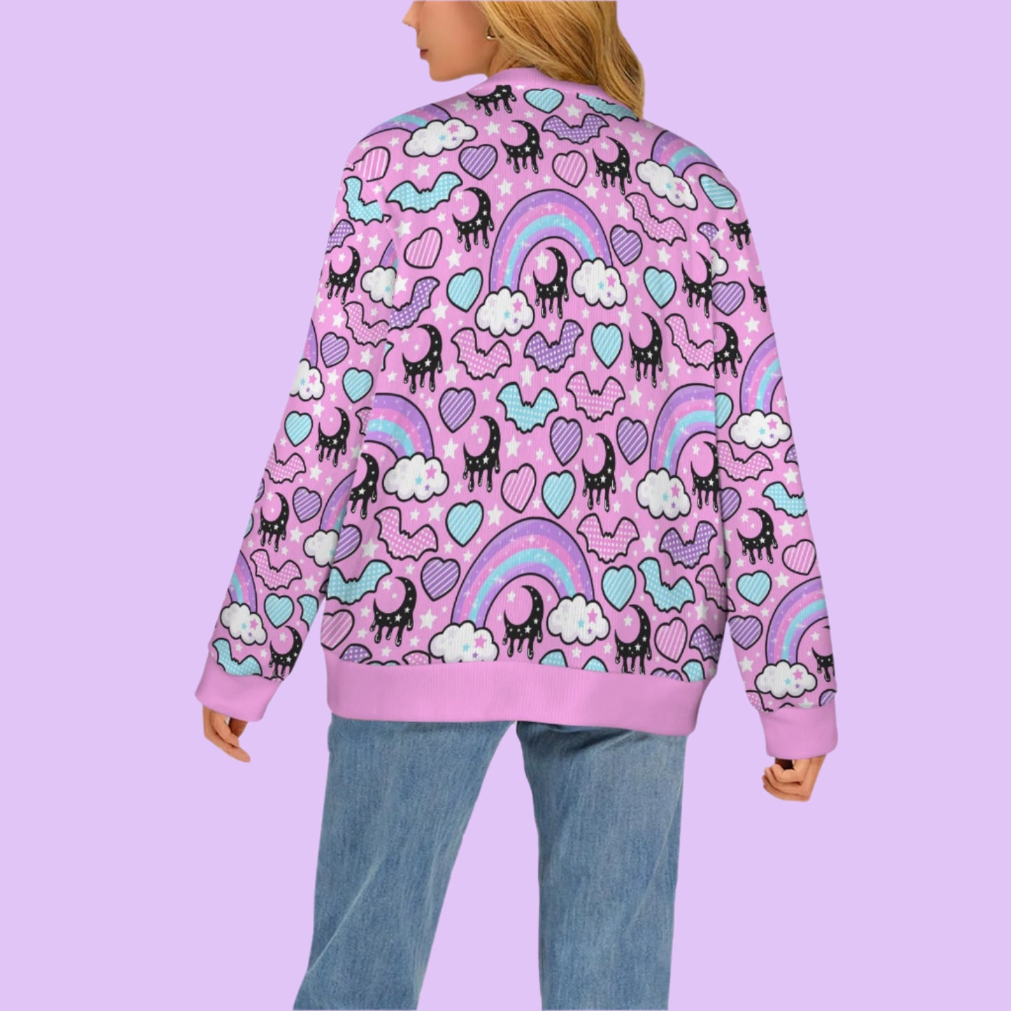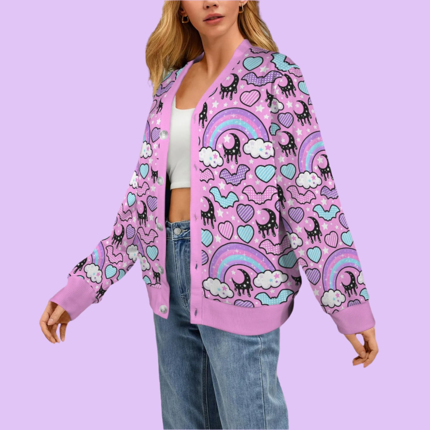 Rainbow Spooky Bats Women's Ribbed Button Up Cardigan (Pink)