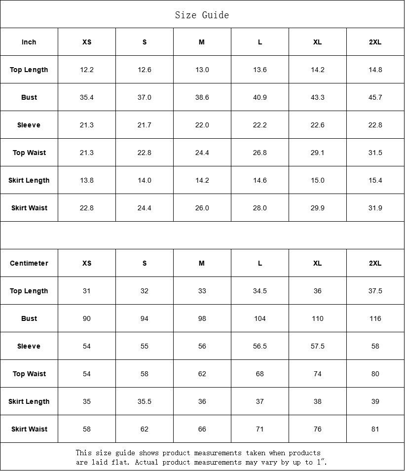 | Skirt Length | 13.8 | 14.0 | 14.2 | 14.6 | 15.0 | 15.4 |
