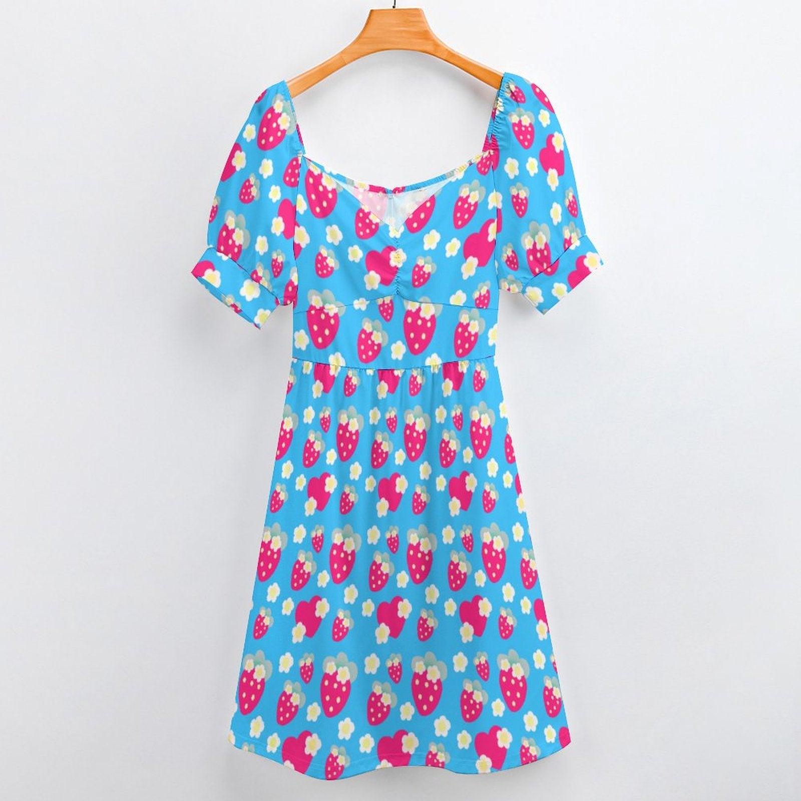 Strawberry Cutie Women's Sweetheart Neckline Puff Short Sleeve A-line Mini Dress (Soda Pop Fruity Berry Blue)