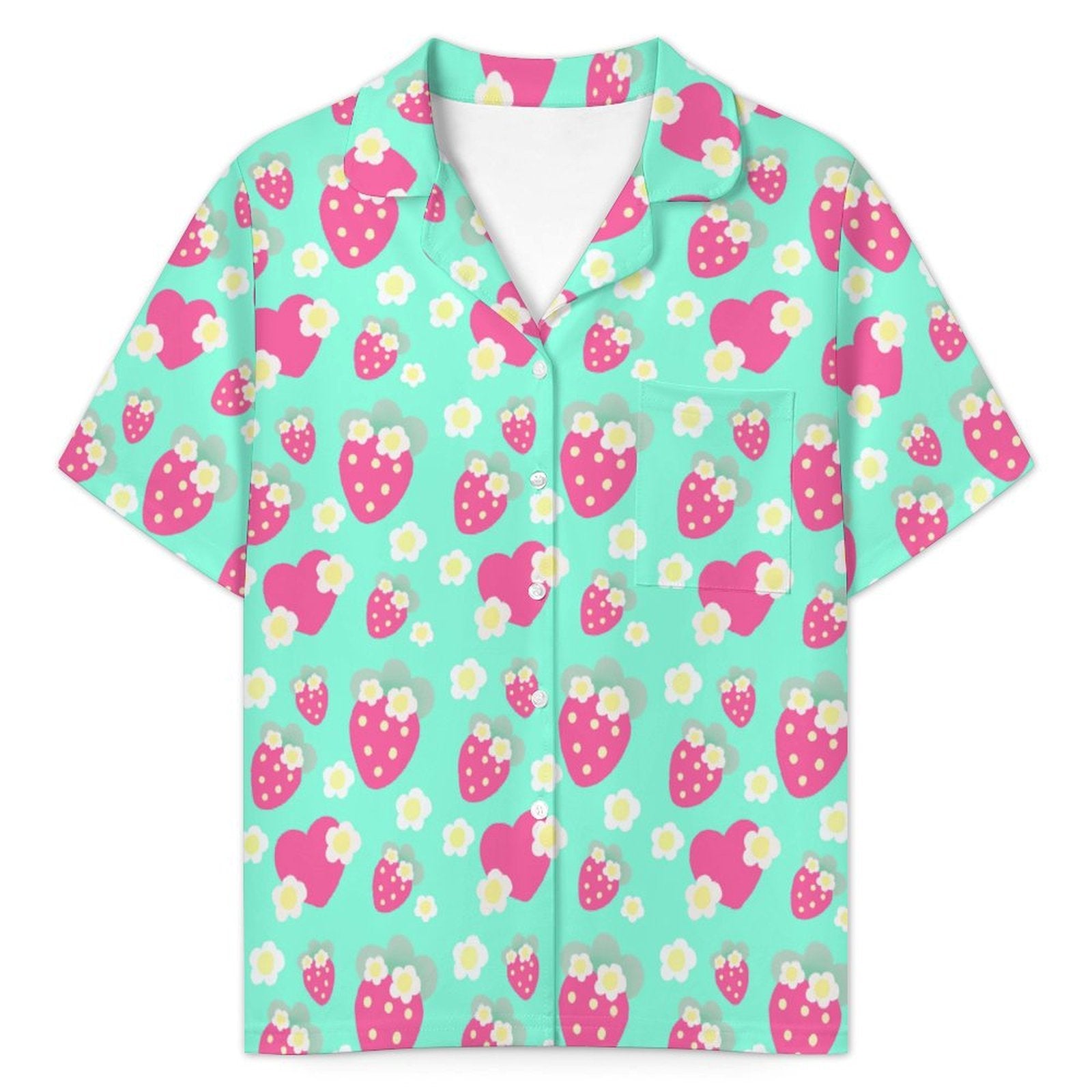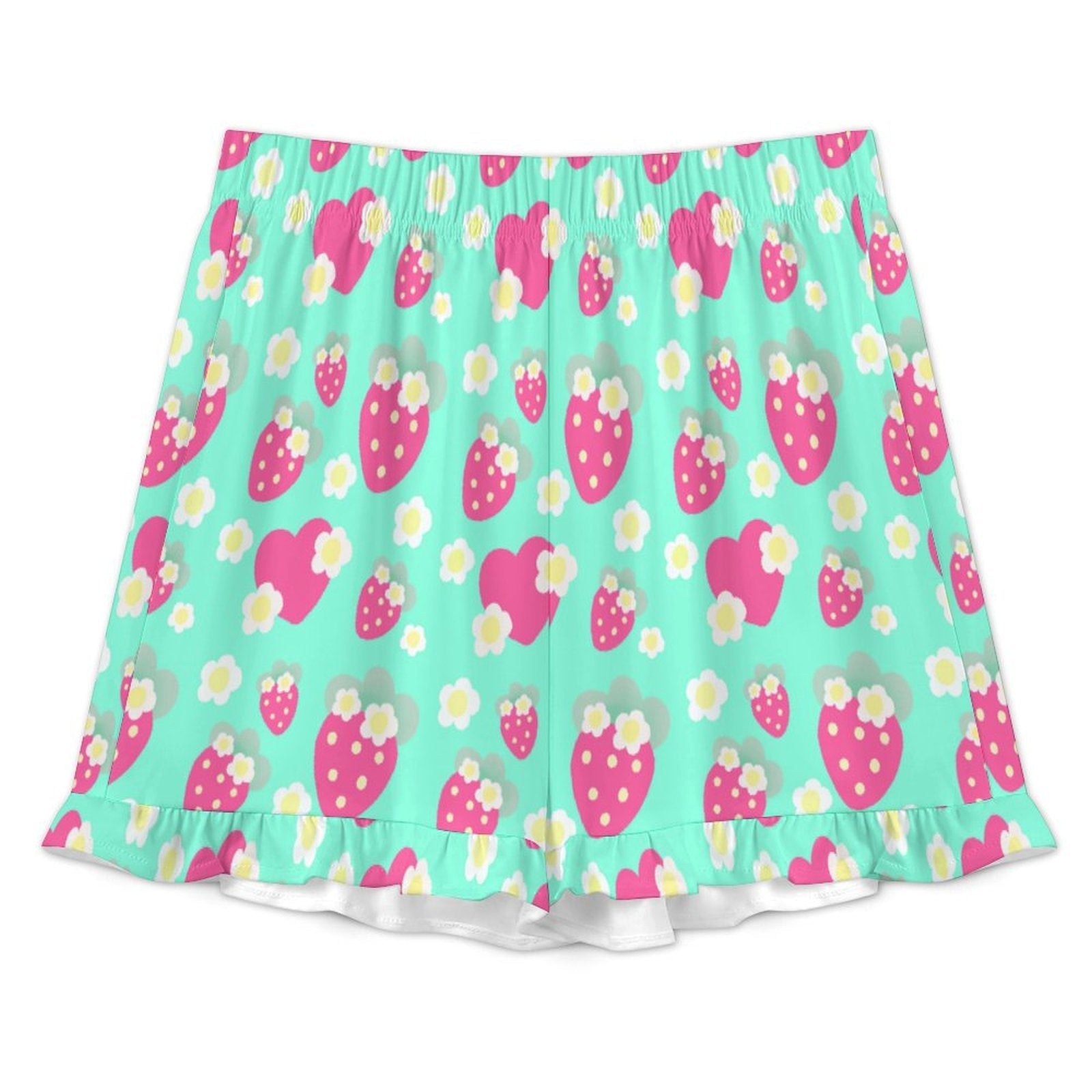 Strawberry Cutie Women's Top & Bottom Pajama Loungewear Set Short Sleeve Button Top Frilly Ruffled Shorts With Pockets (Fruity Berry Mint)