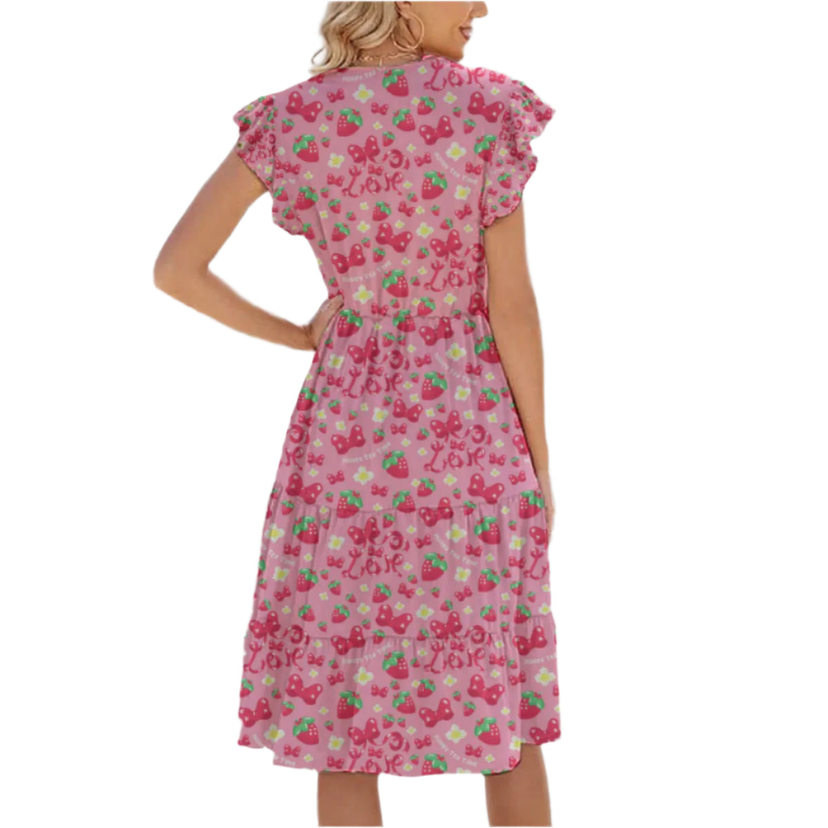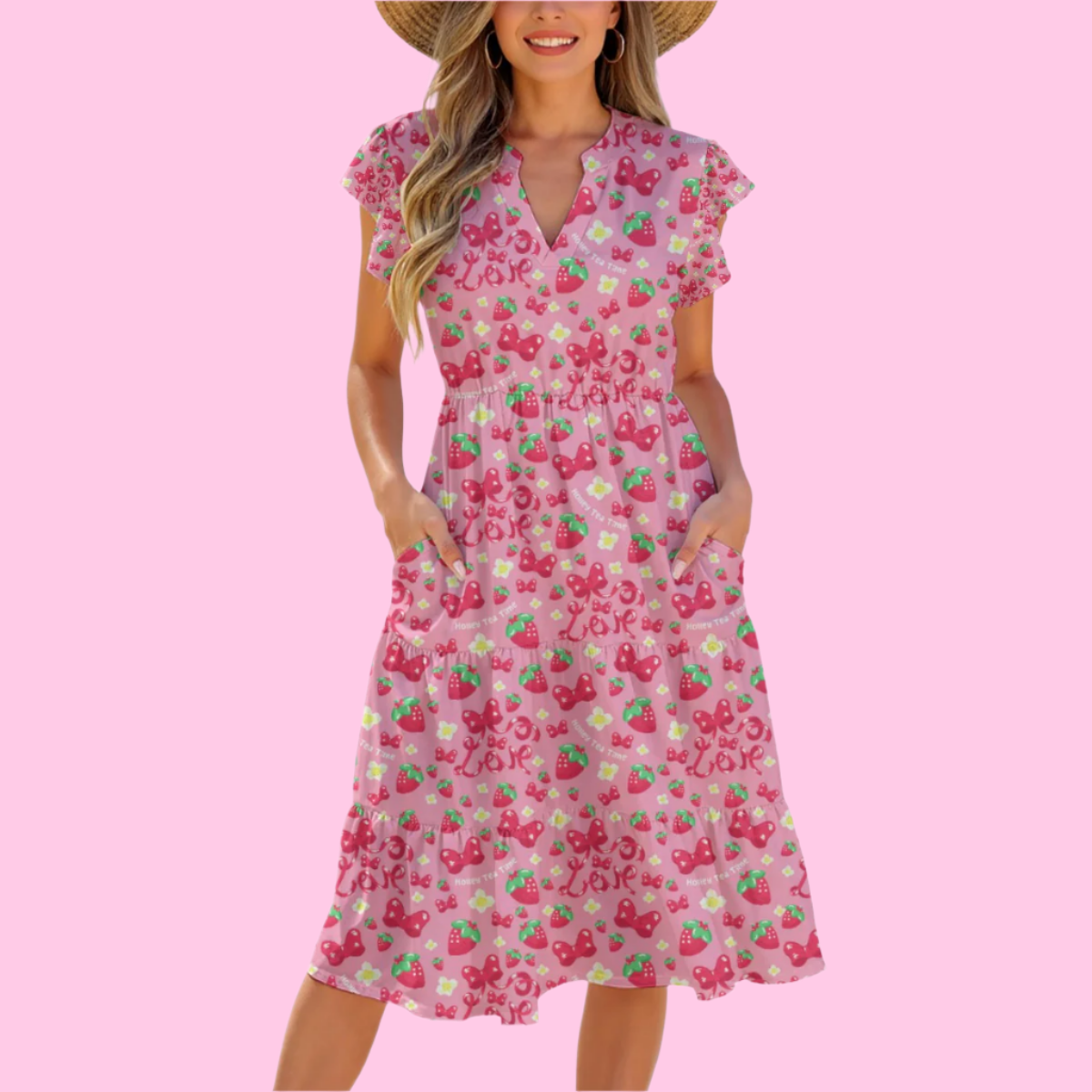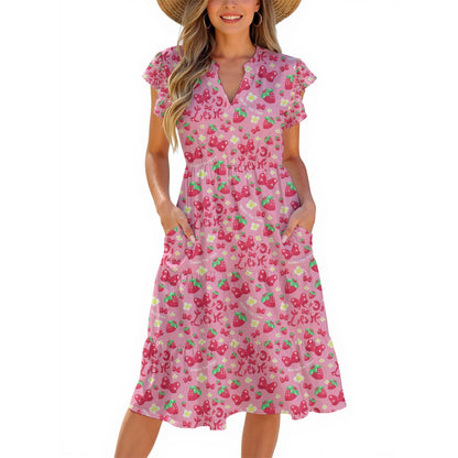 Strawberry Ribbon Cap Sleeve V-Neck Tiered Hem Midi Dress With Pockets