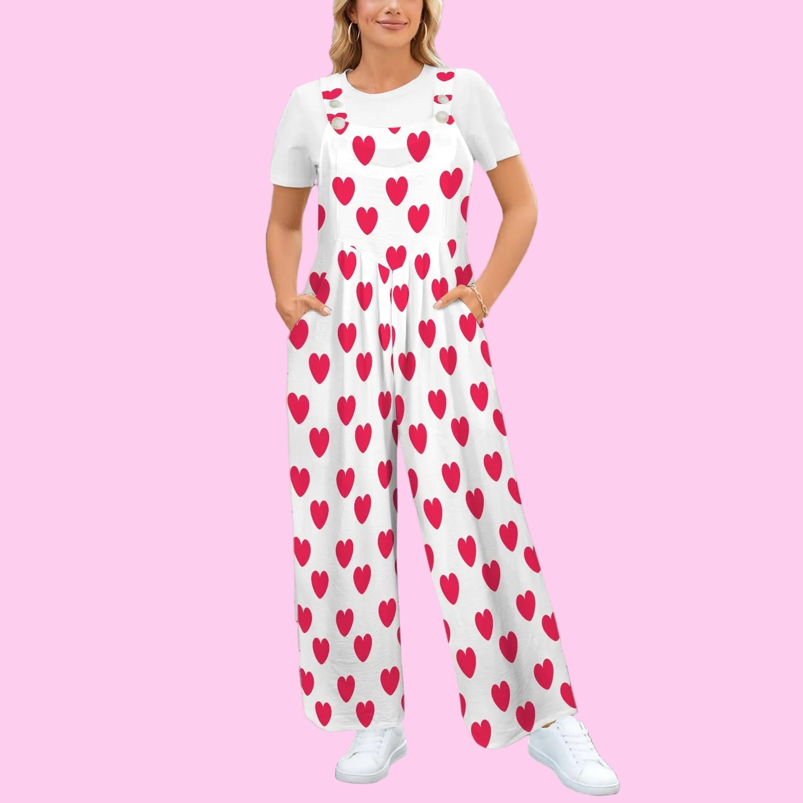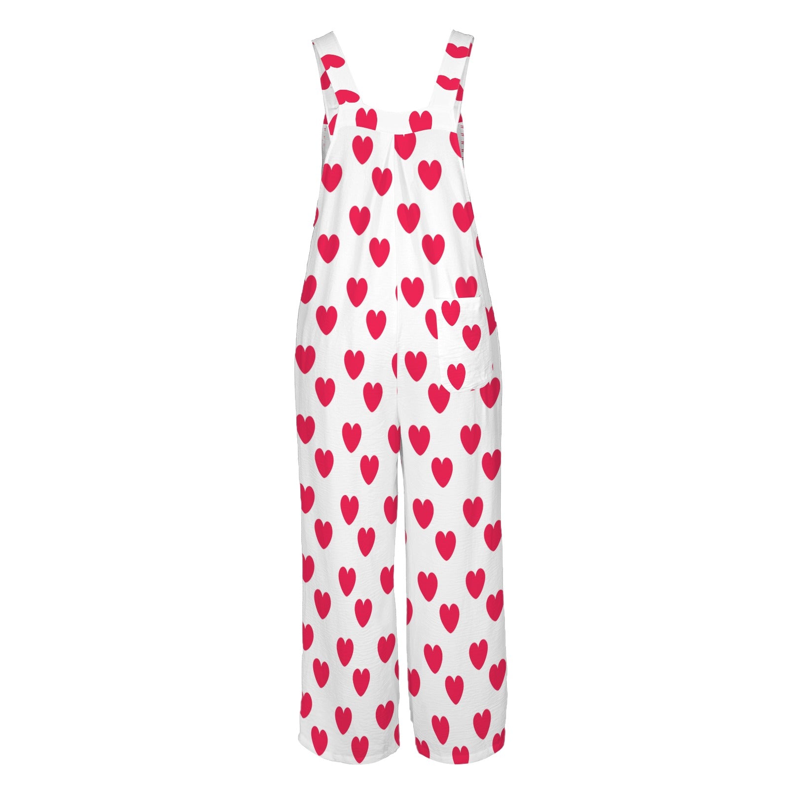 Sweet Love Hearts Adjustable Strap Wide Leg Jumpsuit Overalls With Pockets (Red x White)