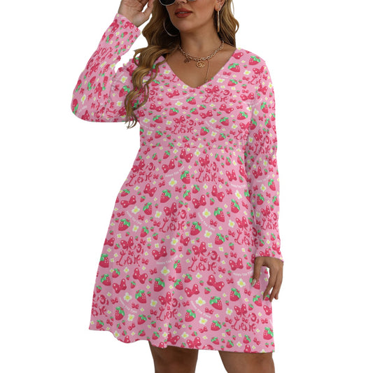 Strawberry Ribbon Women's V-Neck Long Sleeve Dress (Plus Size)