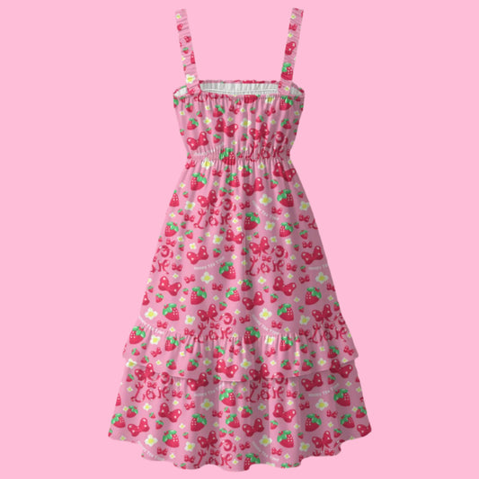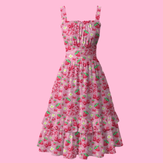 Strawberry Ribbon Cap Sleeve V-Neck Tiered Hem Midi Dress With Pockets